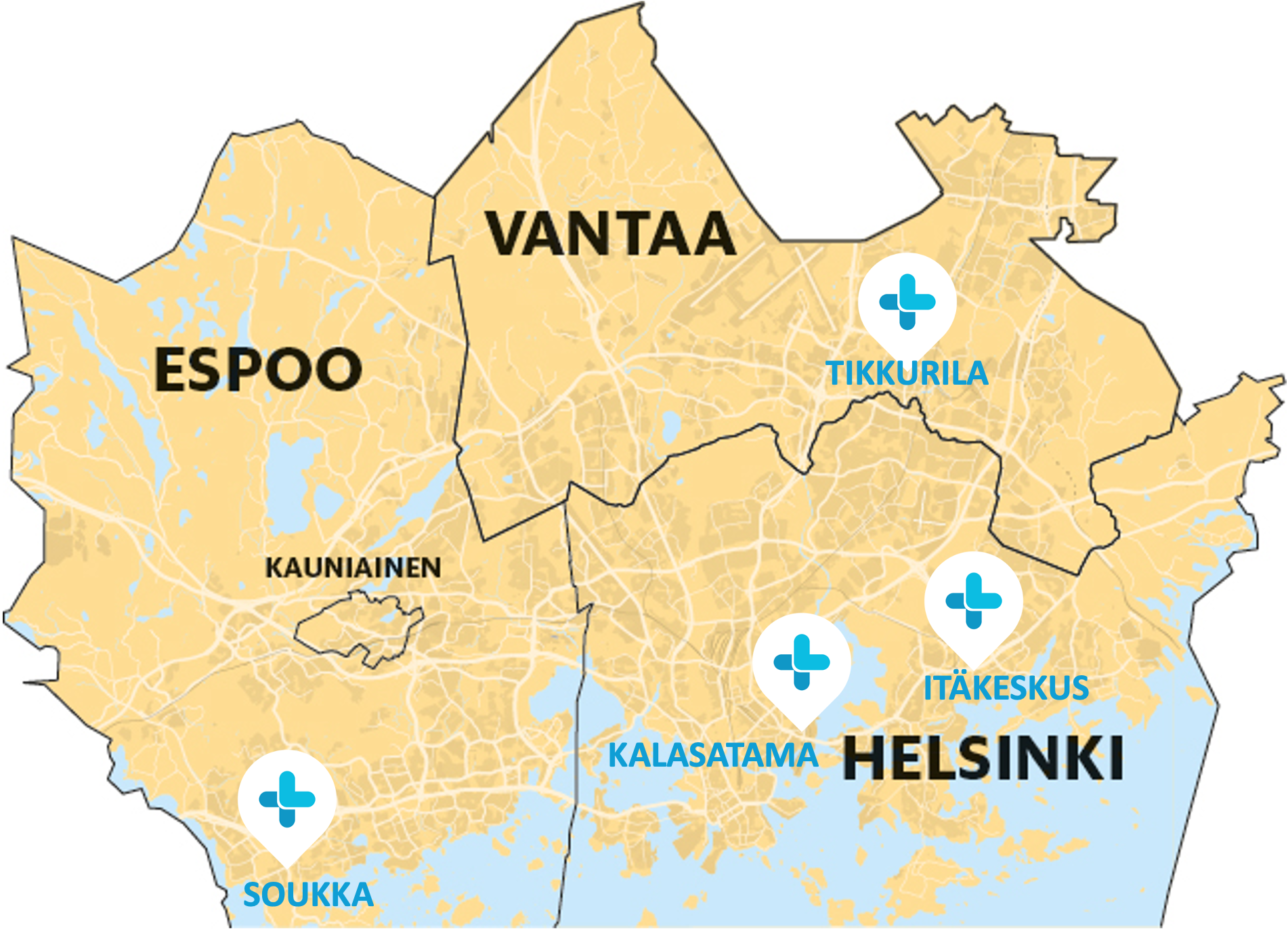 - Toimipisteidemme sijainnit: Helsingissä Itäkeskus ja Kalasatama, Espoossa Soukka ja Vantaalla Tikkurila. Palveluverkko laajenee jatkossa.